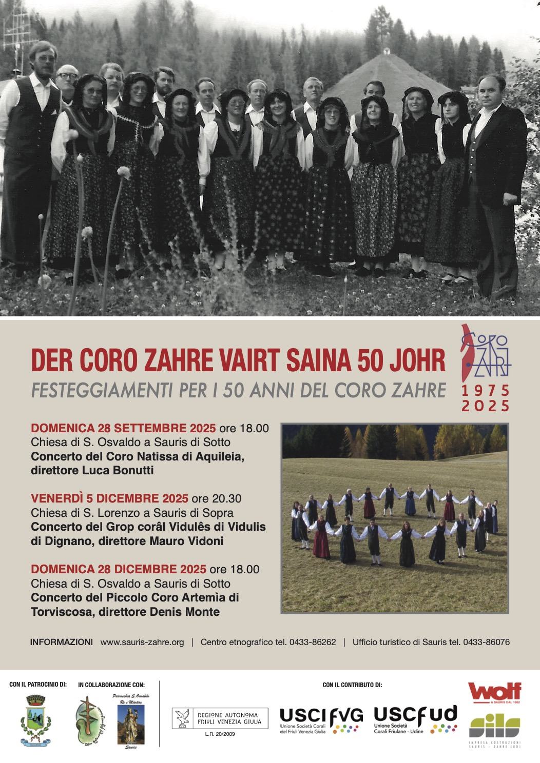 Per celebrare i 50 anni di attività del Coro Zahre, sono in programma tre appuntamenti musicali che si terranno tra settembre e dicembre 2025 nelle chiese di Sauris.